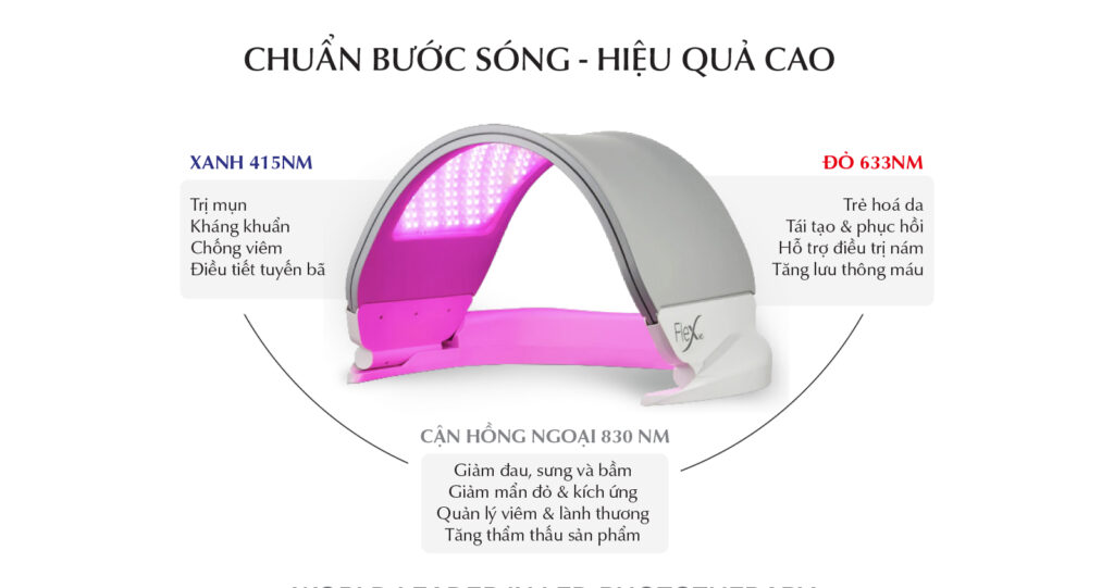 – Ánh sáng xanh 415nm: Đây là bước sóng lý tưởng để điều trị mụn trứng cá. Nó hoạt động bằng cách tiêu diệt vi khuẩn P.acnes – nguyên nhân chính gây ra mụn, đồng thời giúp làm dịu và giảm viêm nhiễm. Đối với những ai đang vật lộn với mụn dai dẳng, Dermalux Flex MD mang đến một giải pháp hiệu quả mà không gây khô da hay kích ứng như một số phương pháp điều trị khác.